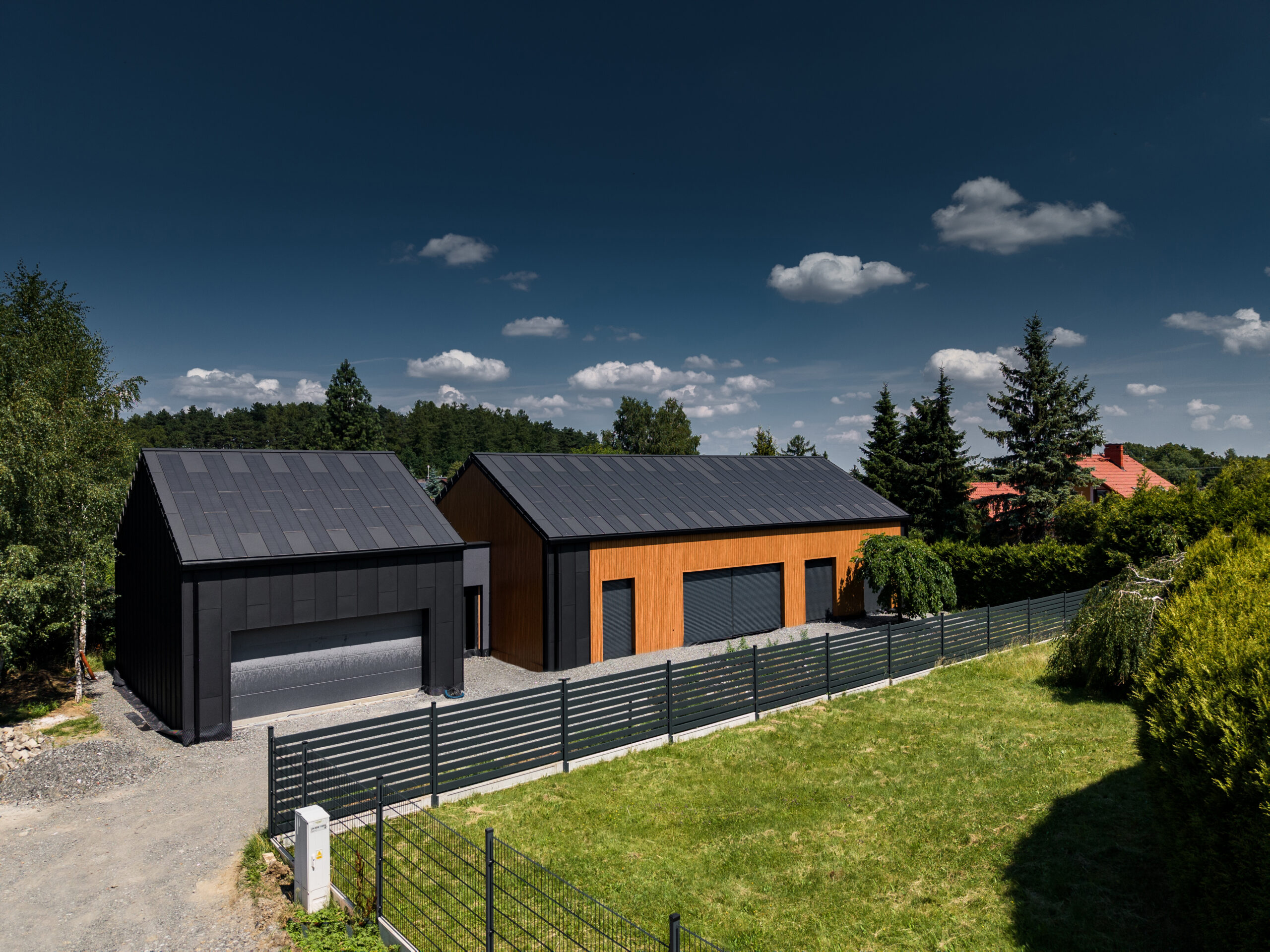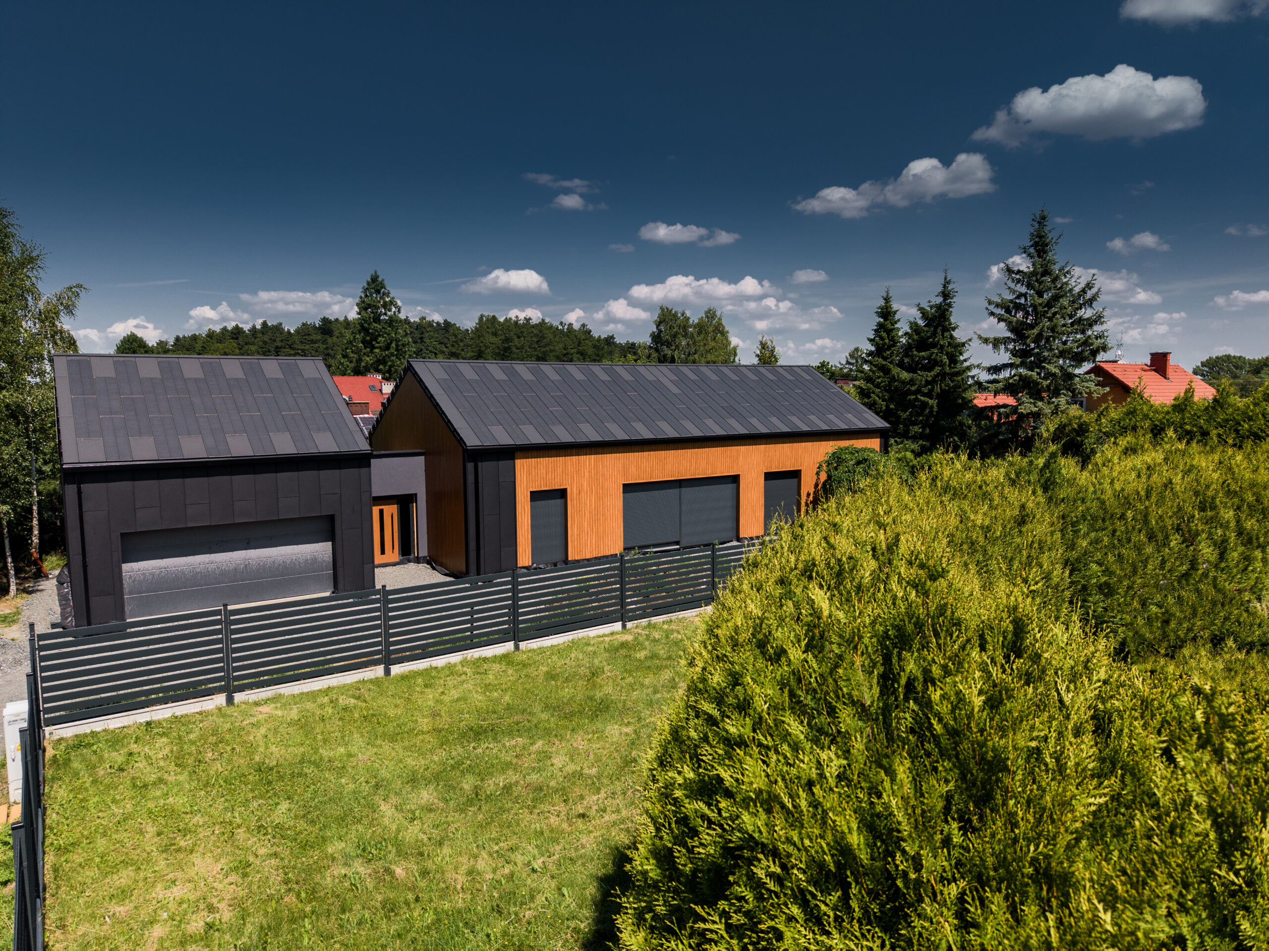 Estetykę budynku podkreślono starannie dobranymi materiałami wykończeniowymi: elewacja garażu wykończona została czarnymi panelami FIT, strefa mieszkalna otrzymała naturalne drewno w ciepłym kolorze, przełamane elementami w postaci paneli FIT w kolorze czarnym na obrzeżach elewacji.